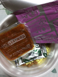 スープの元が3種類入ってます。かやくはすでに入ってるパターン。レトルト調理品?凝ってますね。インスタントはどこまで進んでいくんでしょうか。。の割りにはスープがちょっと薄い感じがしました。お湯をもっと少なめにしておけば良かったかなぁ、、。期待値が高すぎたのだろうか、。