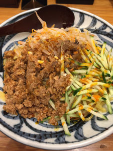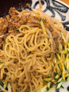冷やしとは言え、冷やし過ぎず、もやし、きゅうり、ひき肉のシンプル、あとはナッツ(何だろう?)か。ひき肉が多めなので、ご飯頼んでもバランスよく食べられそうです。