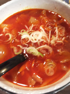 玉ねぎが入ってるので甘い印象はあります。けど辛い。というのも最初にスープの味見をした時に、、ミスりました、喉やられました。一気に喉に流しちゃったんですよね。